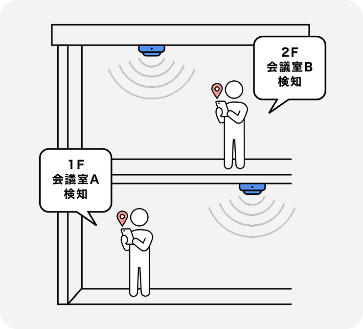 屋内での細かいエリア検知。建物内の特定のフロアや会議室などに対応。GPSが届かない室内での高精度な検知に最適