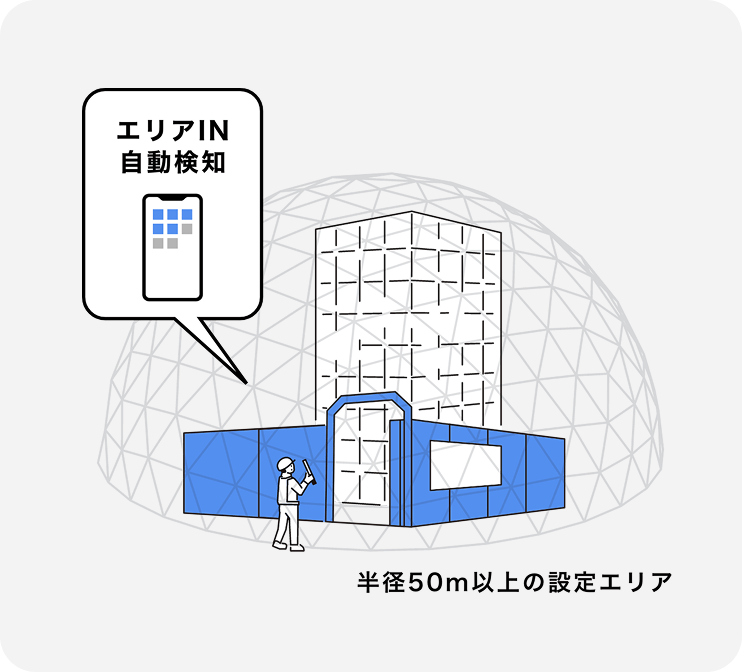 広大な敷地や屋外現場に。半径50m以上のエリアを設定し、バックグラウンドで自動検知。